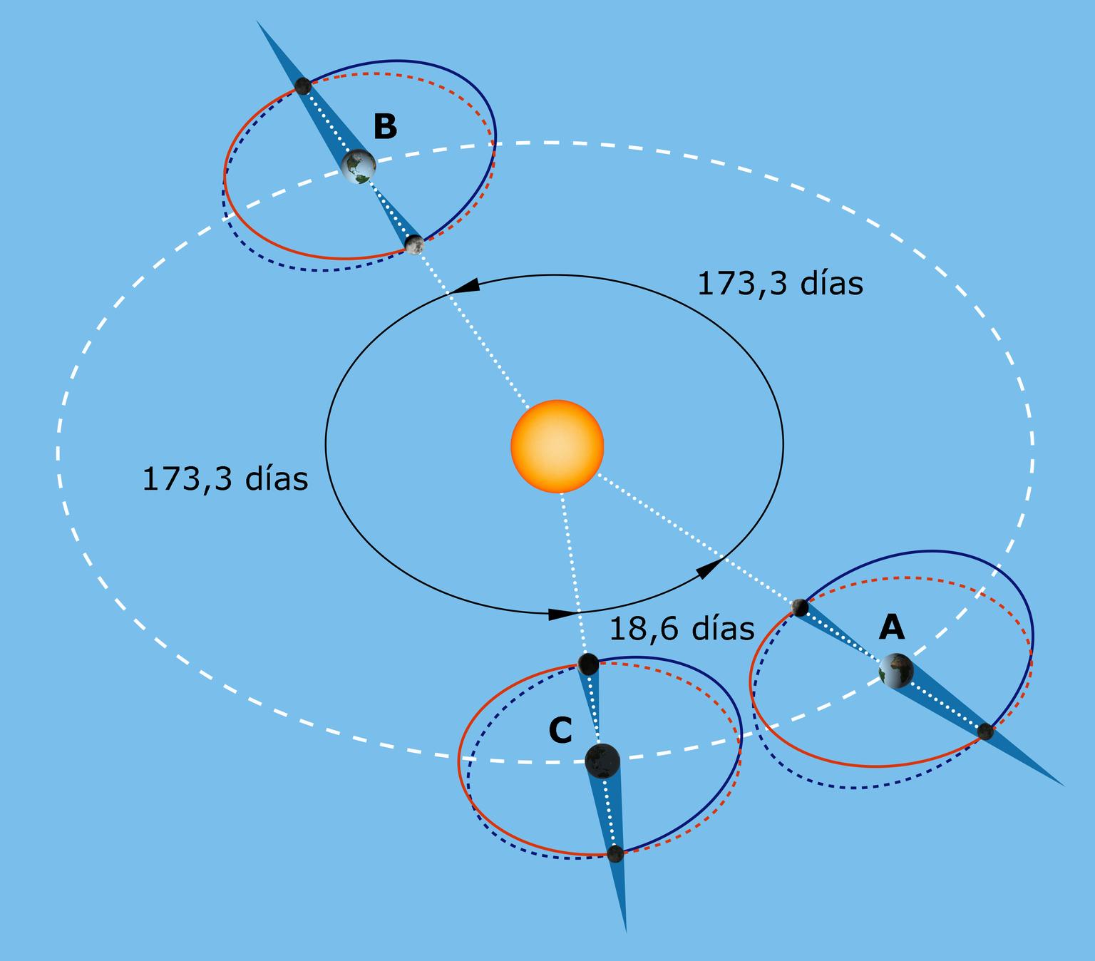 Comparación entre la duración del año de eclipses (desde la posición A hasta C), con el año sidéreo (una vuelta completa). El desplazamiento de la línea de los nodos en sentido opuesto al movimiento de traslación de la Tierra causa el desfase de 18,6 días.
