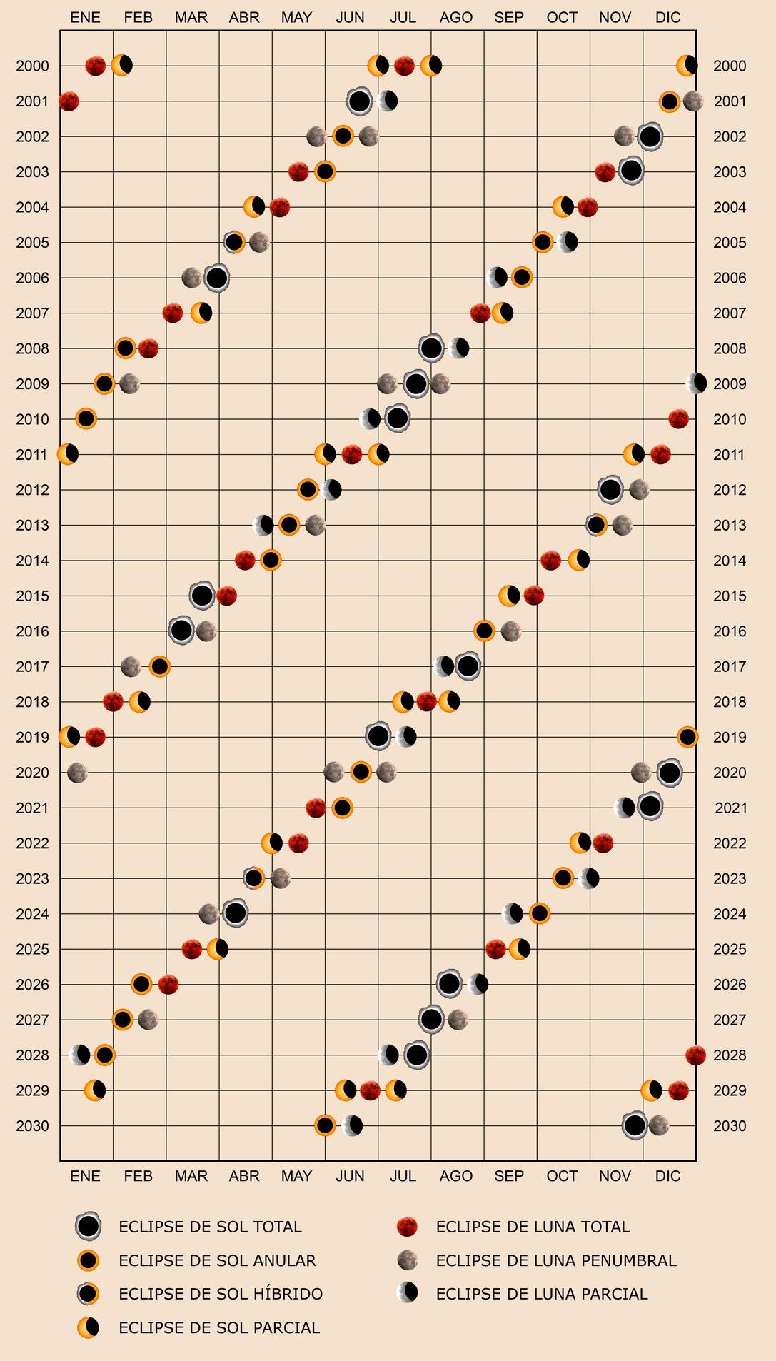 Eclipses de Sol y de Luna entre 2000 y 2030. Cada agrupamiento de dos o tres eclipses se corresponde con una estación de eclipses. Ampliar imagen
