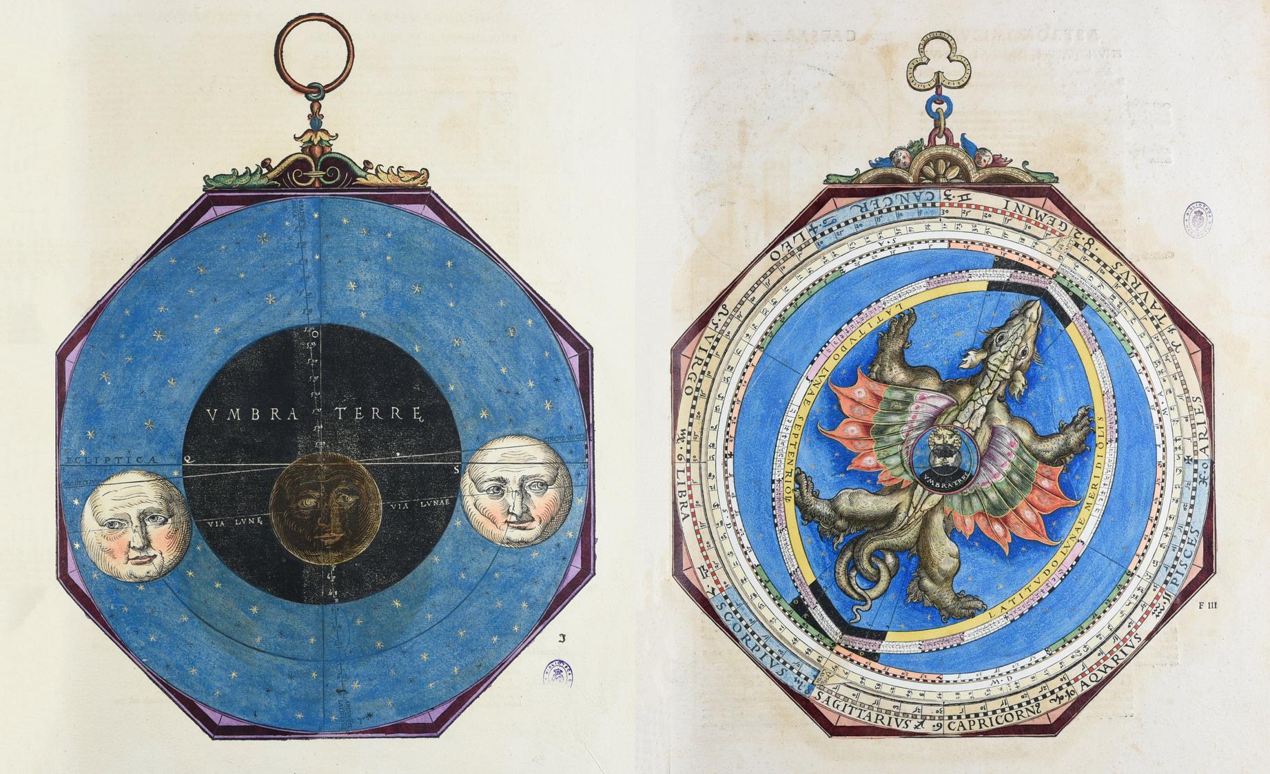 Discos móviles («volvelles»), que permitían calcular la ocurrencia de eclipses. «Astronomicum Caesareum» de Petrus Apianus (1540) | Madrid, Biblioteca Nacional de España.