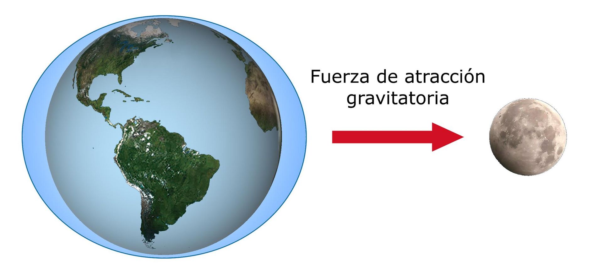 Las mareas se producen de hecho por la influencia gravitatoria sobre nuestro planeta de nuestro satélite y, en menor medida, del Sol. La fuerza de atracción gravitatoria disminuye con el cuadrado de la distancia, por lo que para un cuerpo extenso como es la Tierra, la intensidad de esa fuerza es mayor en la parte de la Tierra más próxima al objeto que ejerce su atracción, y menor en la parte más alejada. En el caso de la Luna, esto se observa como un abultamiento de la parte fluida de la superficie de nuestro planeta, esto es, los mares y la atmósfera, en la dirección en la que se encuentra nuestro satélite.